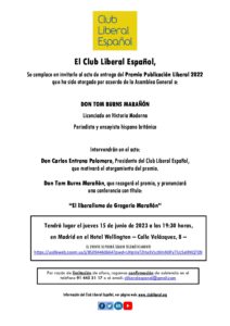 El próximo 15 de junio tendrá lugar el acto de entrega del Premio Publicación Liberal 2022, otorgado de forma unánime por la Asamblea General del Club Liberal Español, a D. Tom Burns Marañón, quién a continuación pronunciará una conferencia con el título "El liberalismo de Gregorio Marañón". El acto se celebrará en formato híbrido: presencial en el Hotel Wellington, de Madrid (por razón de limitación de aforo se precisa confirmación de asistencia previa en el teléfono 914455117 o en el…
